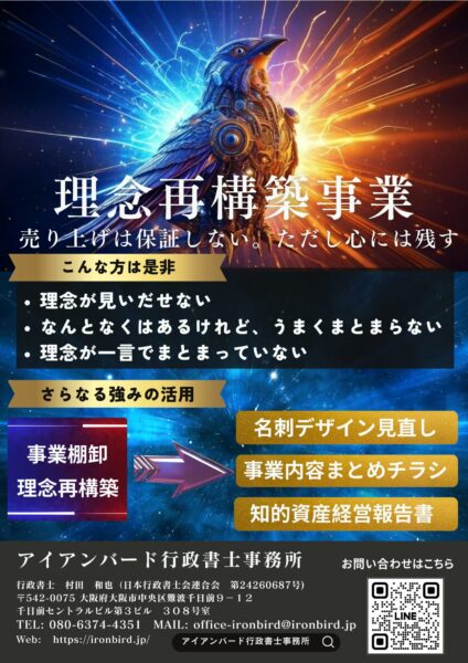当事務所では理念再構築事業に合わせて、事業まとめチラシデータ制作も行っております。事業を紹介するチラシでもあると説明が非常にしやすくなります。お持ちでない!という方は是非当事務所までご相談ください。